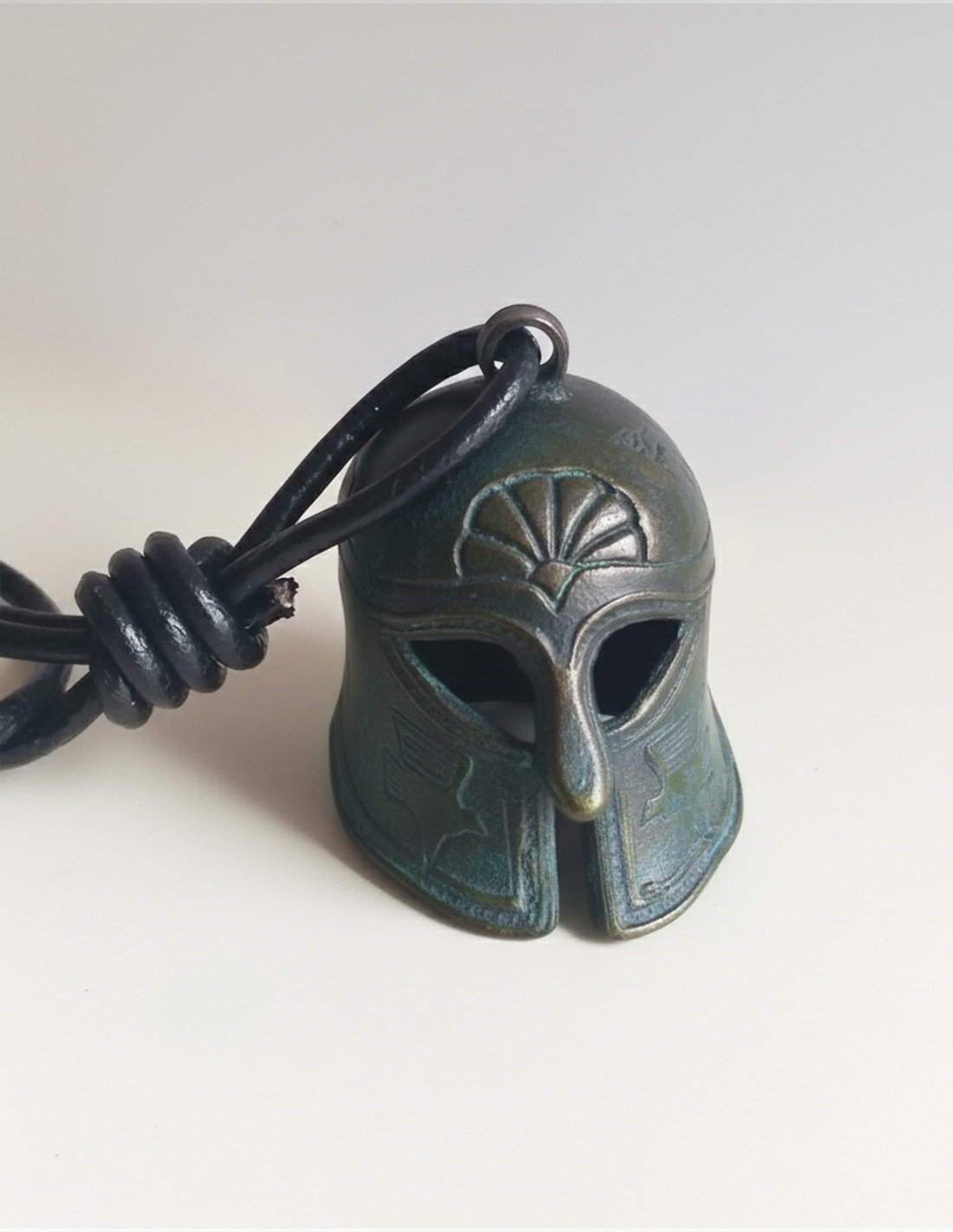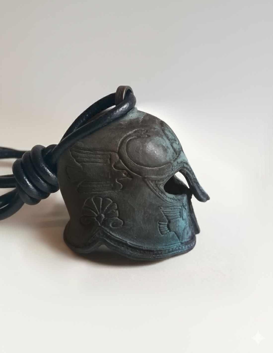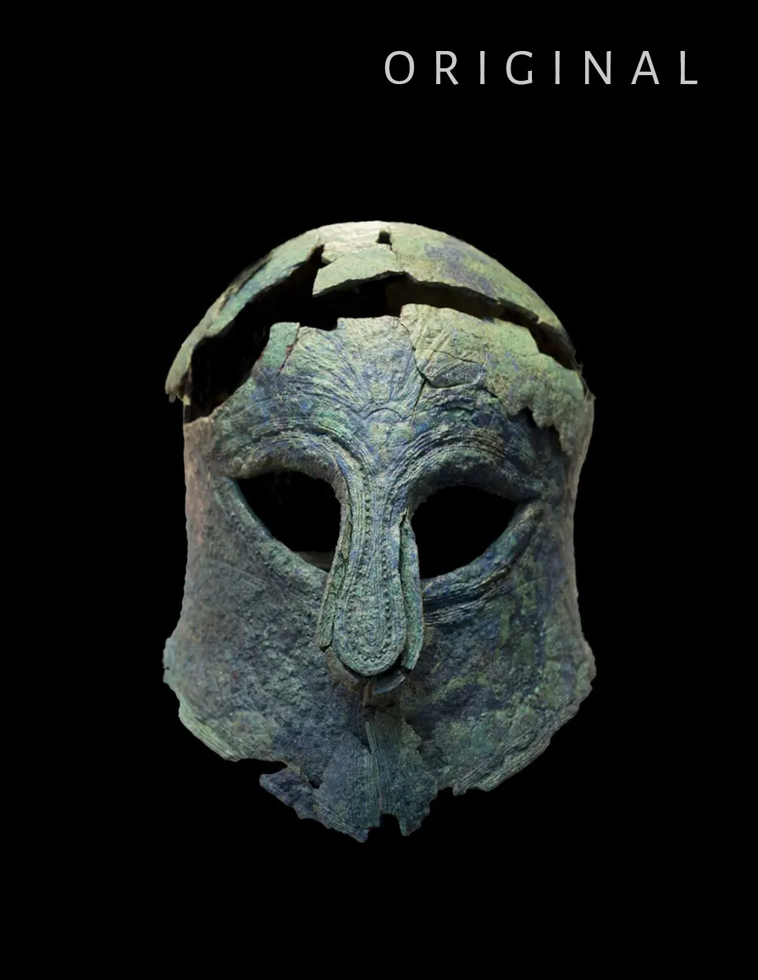 Miniatur-Replik eines korinthischen Helms, der möglicherweise aus Magna Graecia stammt, mit einer großen zentralen Palmette, Schlangen über den Augenöffnungen und vier Adlern. Die gefundenen Überreste würden zu einem Mann gehören, wahrscheinlich einem Griechen, einem Söldner der Phönizier in Malaka, aus dem 6. Jahrhundert v. Chr.