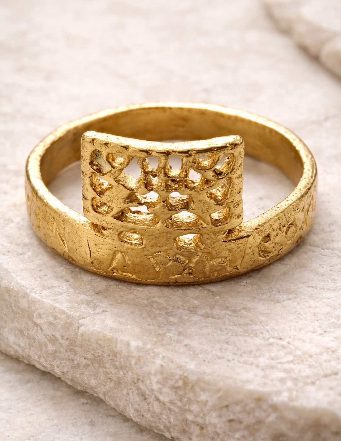 Er verfügt über ein rechteckiges Siegel oberhalb des Rings, verziert mit einer Durchbruchtechnik, mit einem Motiv von zwei Delfinen, die einem Dreizack gegenüberstehen. Der Außenring trägt eine griechische Inschrift, die einer Frau gewidmet ist.