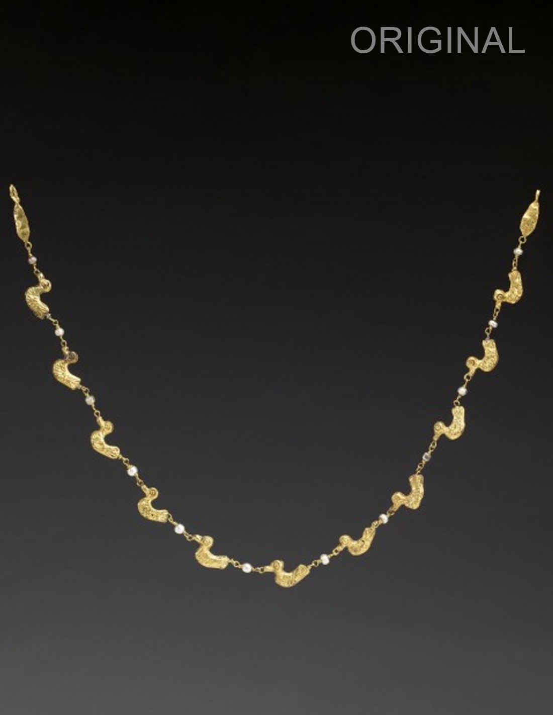 This creates the false impression of a very costly necklace, as do the glass beads that resemble pearls. he original wanted to give the appearance of being solid, our replica ducks are solid. 4th-5th AD (Late Antique) Byzantine necklace found in Nazareth, Israel.