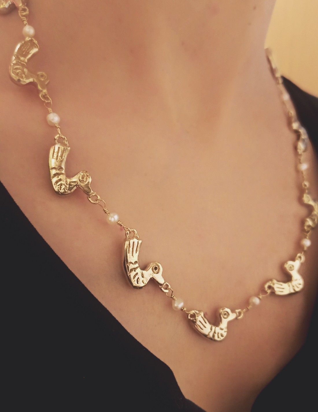 This curious necklace is made of brass and small pearls, it is an interpretation of a Byzantine necklace belonging to the Walters Art Museum, Baltimore, USA.