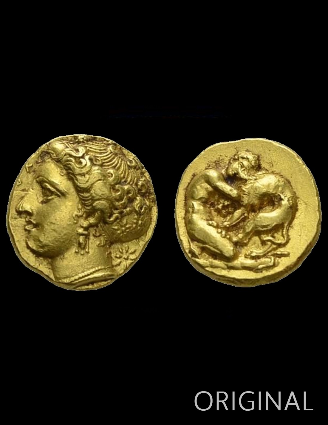 La réplica de esta conocida moneda griega se llama doble decadracma, la original fue encontrada en Sicilia. Este tipo de moneda, los decadracmas, son de las más bonitas y reconocidas de la antigüedad y que fueron acuñadas por Dionisio I de Siracusa (405-367 a.C).