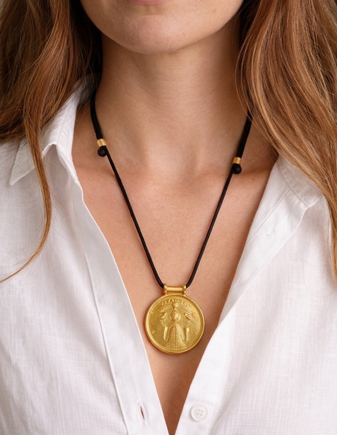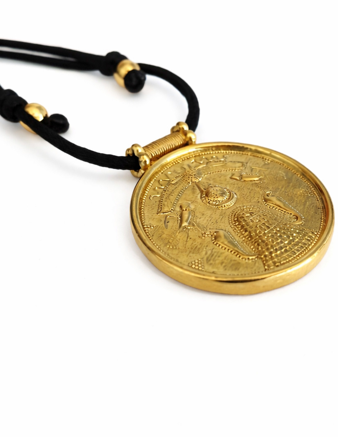 Le relief narre la cosmogonie égyptienne : la naissance du monde sur un tertre sacré gardé par des divinités protectrices. Le tertre primordial émerge du chaos, flanqué de figures sacrées telles que le faucon d'Horus et le serpent Uræus, sous un soleil ailé. Pièce exceptionnelle, elle allie la maîtrise technique de la granulation et du filigrane aux croyances spirituelles que les Phéniciens ont diffusées dans tout le bassin méditerranéen.