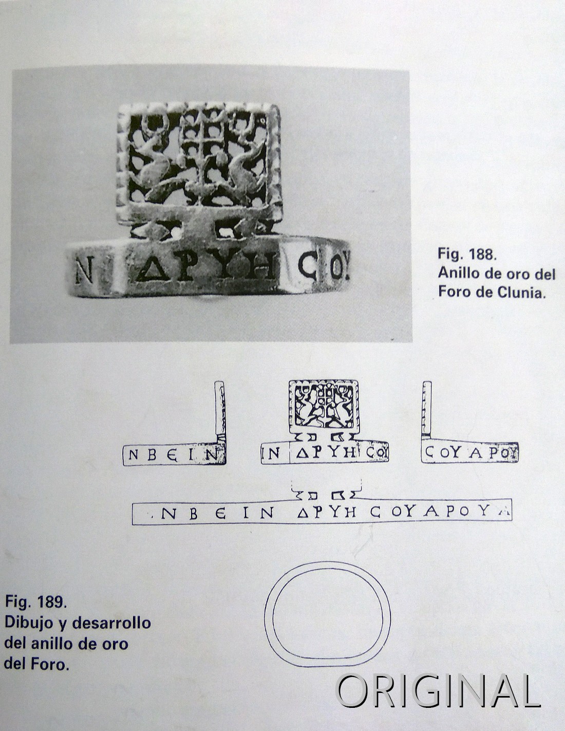 Reproduction d’une bague romaine en or découverte dans la villa romaine de Clunia (Burgos). Apparue dans le Forum, à un niveau datant de la fin du IIe ou du début du IIIe siècle ap. J.-C.