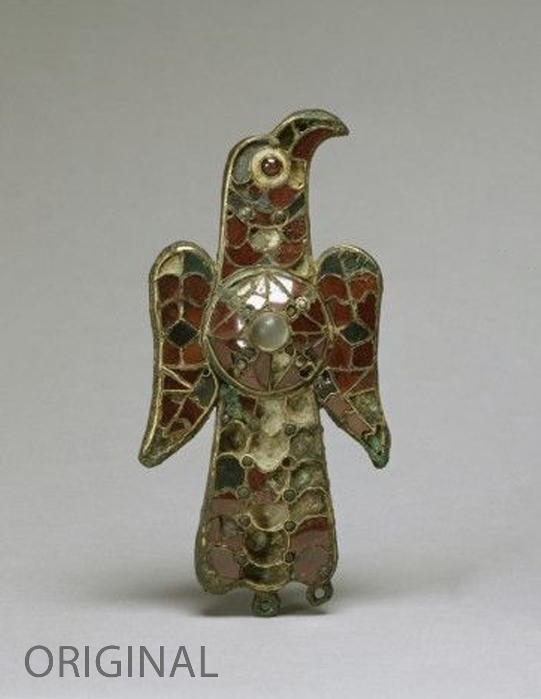 Réplique en bronze doré d’une fibule en forme d’aigle (original en bronze plaqué or), avec un bouclier central circulaire et une décoration cloisonné.