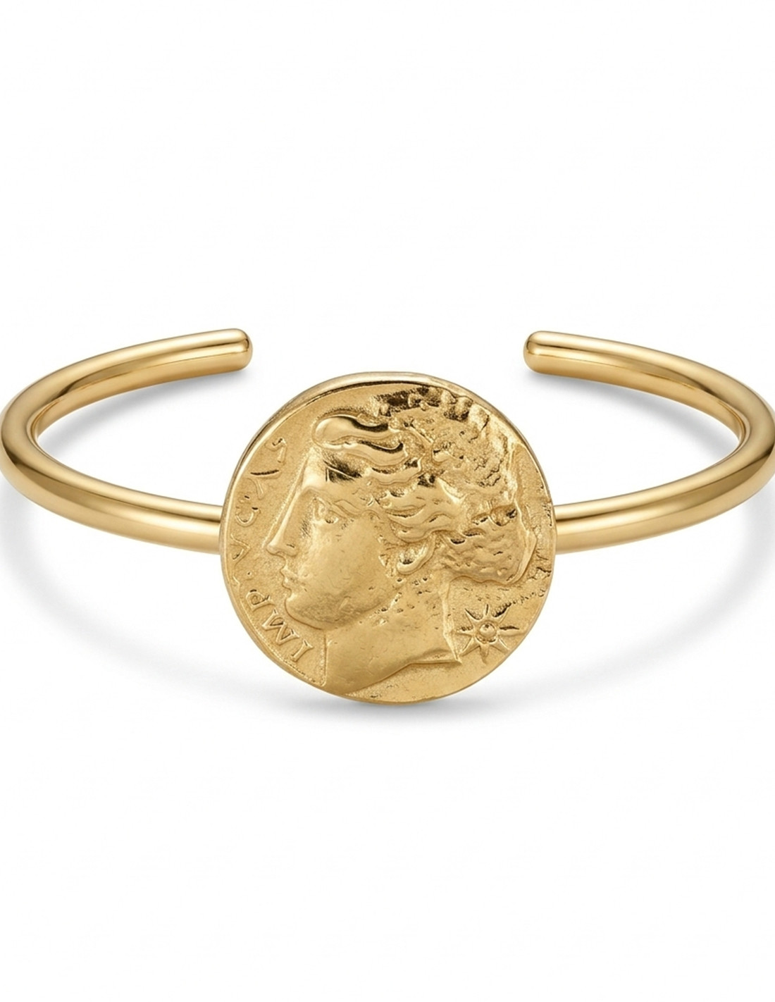 Este sencillo y elegante brazalete tiene en su grueso aro soldado a mano, la réplica de una moneda griega llamada decadracma, encontrada en Sicilia.