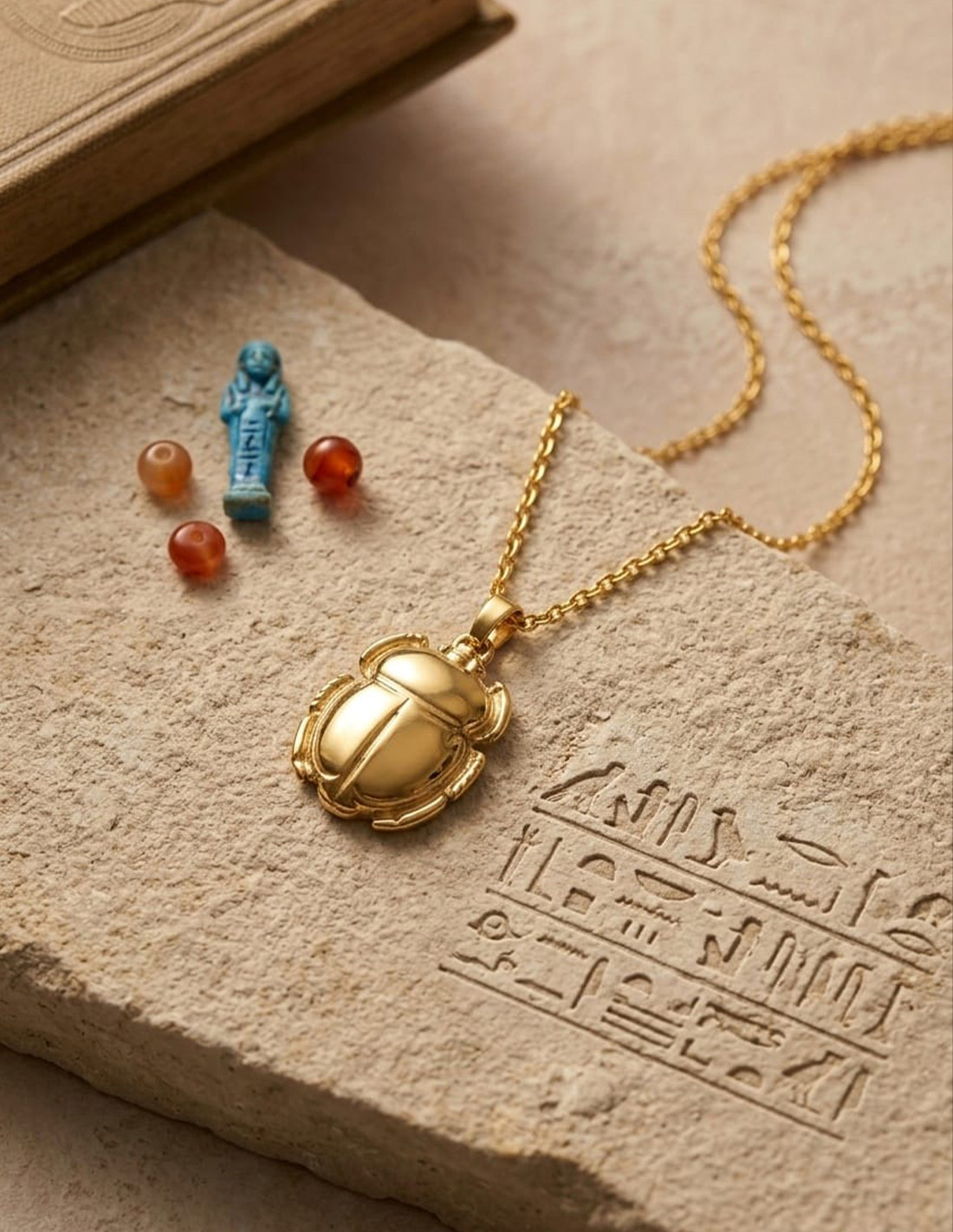 Lo scarabeo egiziano, detto anche scarabeo sacro, simboleggia il cambiamento, la vita eterna e la rinascita quotidiana. È associato al dio Khepri, considerato colui che spinge il sole attraverso il cielo ogni giorno.