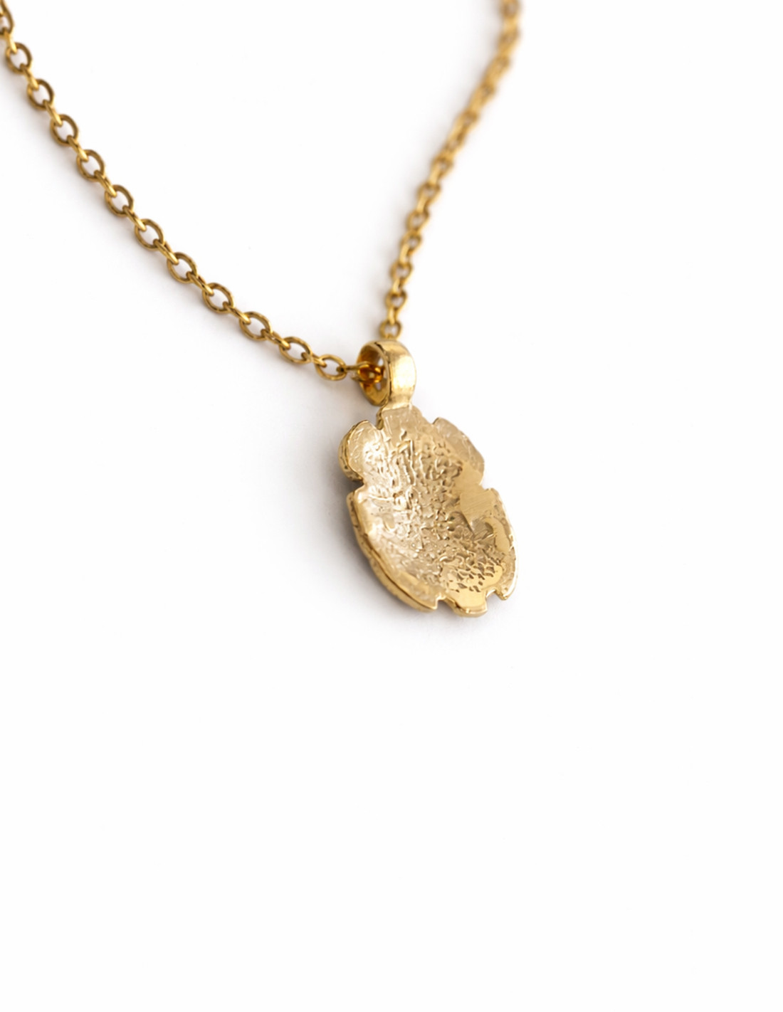 Realizzato in bronzo giallo, con catena in acciaio placcato oro.